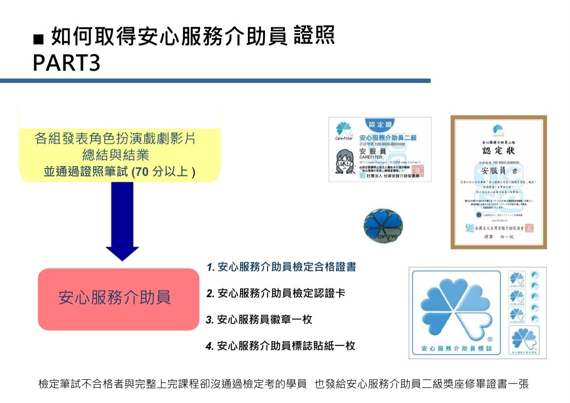 1.線上視訊學科課程:在家自修安心服務介助員檢定教科書與自修習題(100題),邊看書邊作答,完成後回傳答案卷,經批閱滿60分才能上線下術科課程。
